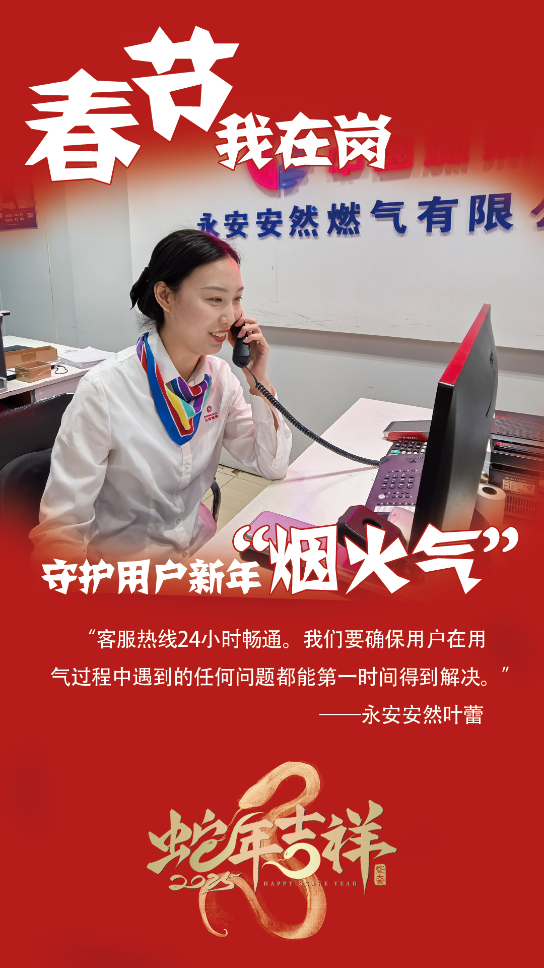 在永安安然营业厅里,电话铃声此起彼伏,一片忙碌景象。叶蕾是这里的一名客服人员,春节期间,她和同事们坚守岗位,用热情周到的服务为市民解决各种燃气问题。